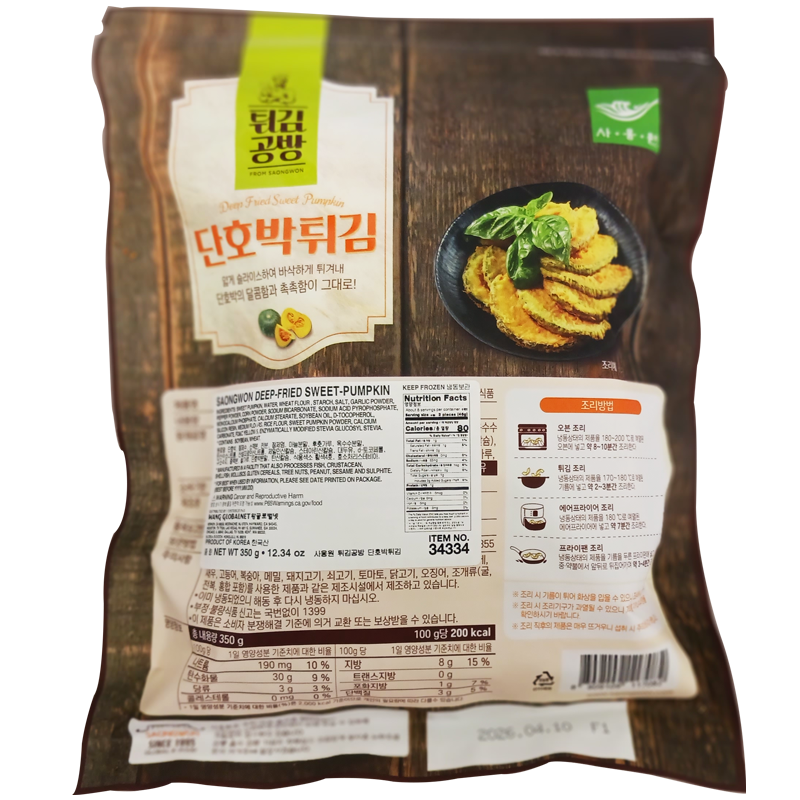 사옹원 단호박 튀김은 자연 그대로의 달콤한 단호박을 바삭하게 튀겨낸 제품입니다. 고소한 풍미와 부드러운 식감이 조화를 이루어 누구나 간편하게 즐길 수 있는 간식입니다.